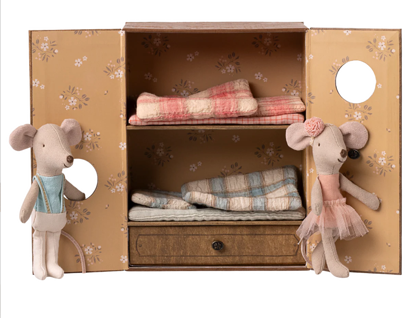 Open the doors of this magical playset and explore a world of dance, stardust and storytelling. This enchanting set transforms from a cosy mouse house to a ballet studio where dreams take centre stage. The mirrored wall glimmers while the magnetic barre holds fast to every tiny paw as the mice rehearse their grand performance. Two ballet mice, already dressed for the spotlight, wait eagerly in their beds, ready to twirl and tell their stories on stage.