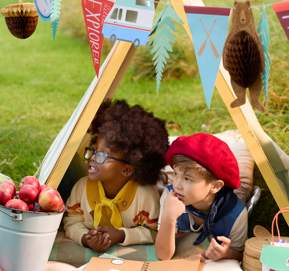 Let's go camping! Transform your party into an outdoor adventure with our camping-inspired range. Designed for little explorers and nature lovers to bring the magic of the great outdoors to your celebration. This statement garland, with retro summer-camp pennants and honeycomb embellishments, is perfect to decorate backyard gatherings, or hang indoors on the party table, wall or mantel for a cosy camping vibe. Just add s'mores, stories and party games for a fun time.
