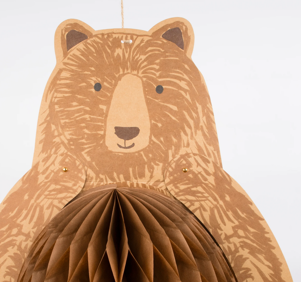 - Giant hanging tree and bear decorations with tissue paper honeycomb details