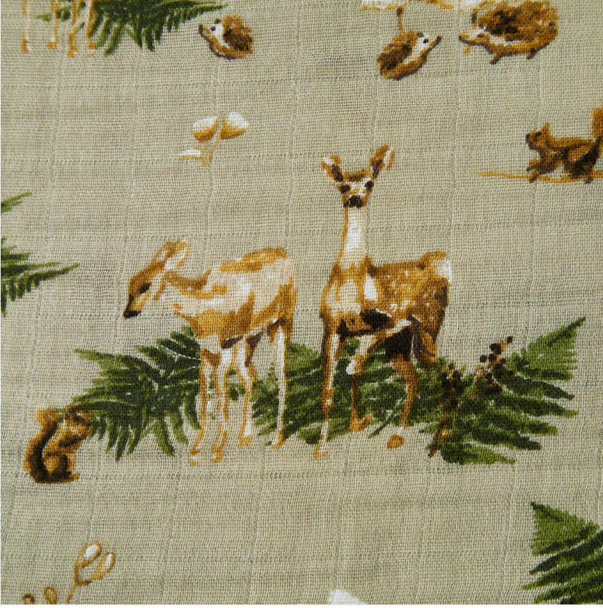 Our sumptuously soft and generously sized newborn and baby organic cotton Muslin Swaddle Blanket in the Forest Party print helps your little one feel safe and secure while being wrapped in smooth and gentle luxury.