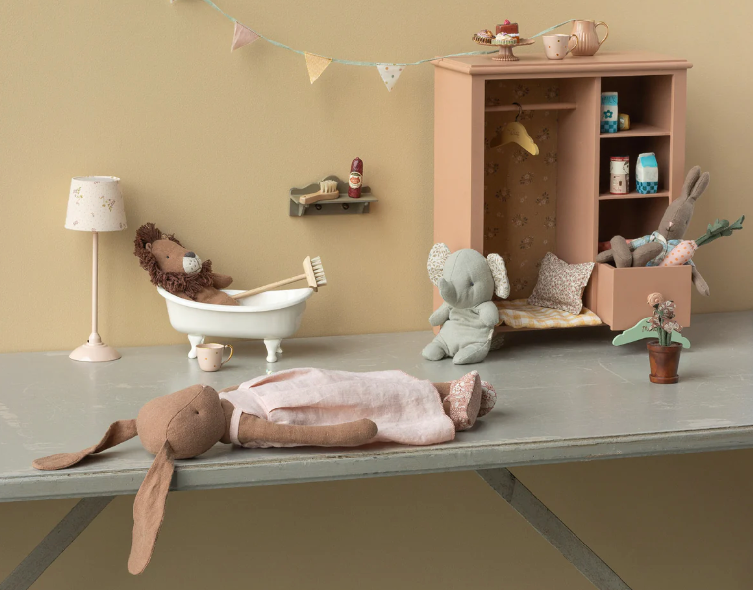 The beautiful Maileg miniature floor lamp is a must-have. The lamp will light up the room with a soft tone - remember to turn off the light when the friends go to bed. The product comes without battery, but you can add a coin cell battery (CR2032).