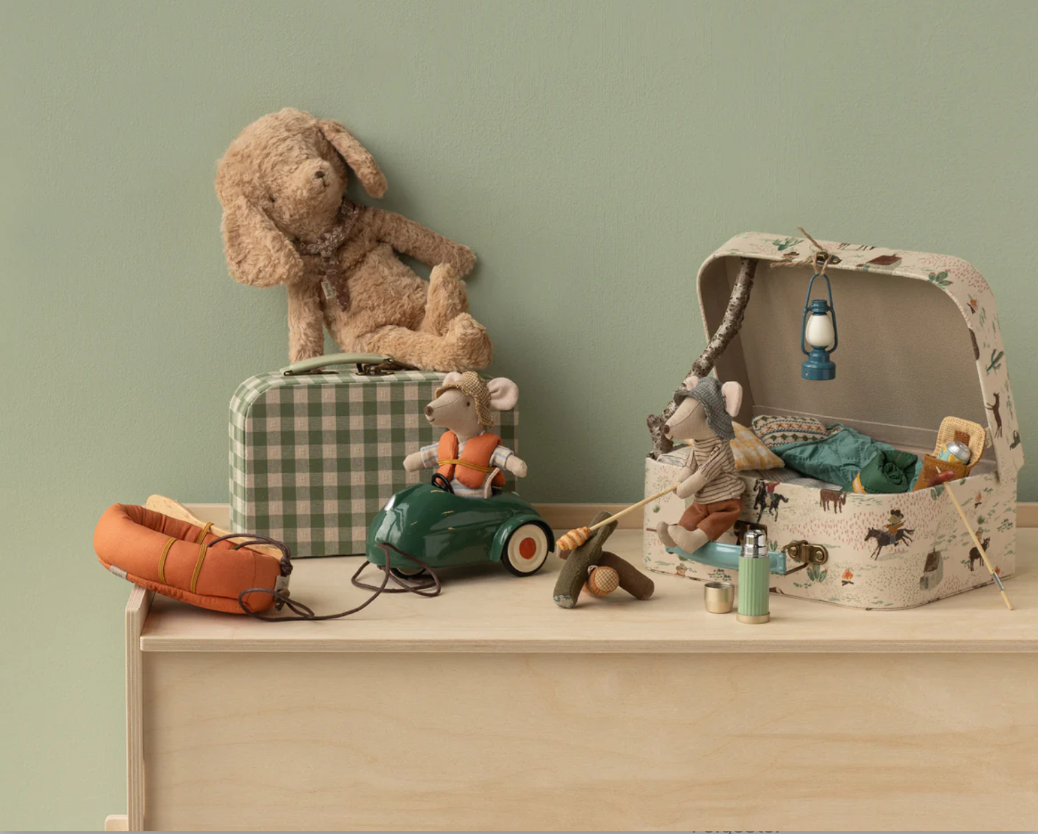 This little rubber boat is made of fabric and comes with life vest and paddle. It is not waterproof, so you have to imagine floating on the water. Combine it with the hiker mice and other outdoor accessories to extent the story.