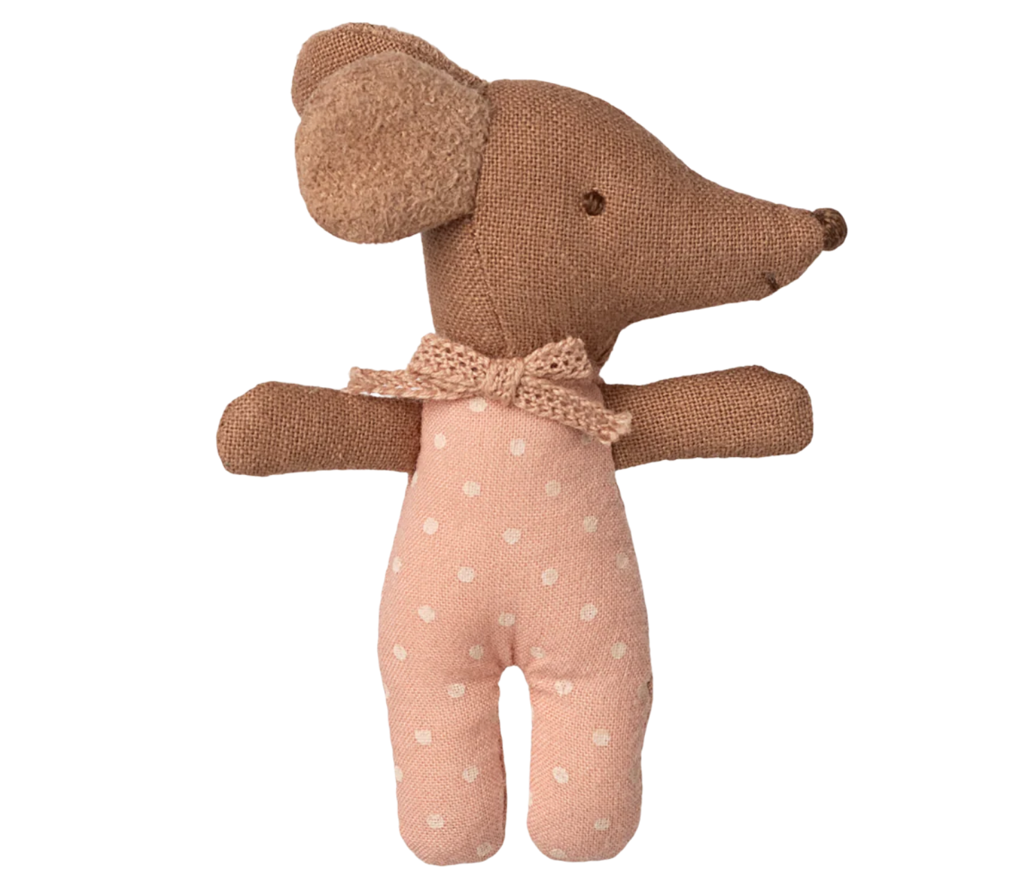 A Maileg favourite, this Baby Mouse comes tucked inside her very own matchbox bed. Dressed in a cosy spotted suit with a pink bow, she rests on soft patterned bedding, ready for sweet dreams. Her face is double-sided, with one side sleepy and the other wakey, so you can choose whether she is ready for a peaceful slumber or a day of play.