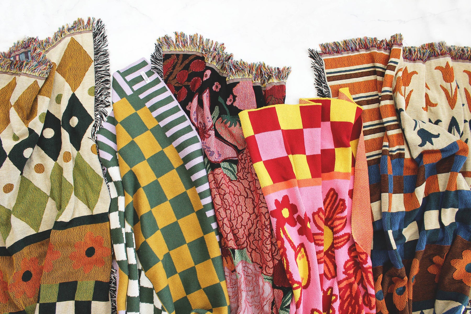 Inspired by vintage wallpaper and patterns. Mix and match and add a playful pop. JUST DANDY DAFFODIL in greens, gold, orange BLUE BELLS in burnt orange, blues, browns Multicolor tapestry blanket. 50"x68" not including fringe. 94% Recycled Cotton/ 6% Acrylic. Machine wash cold, tumble dry low. Designed in Brooklyn & Made in the U.S.A.