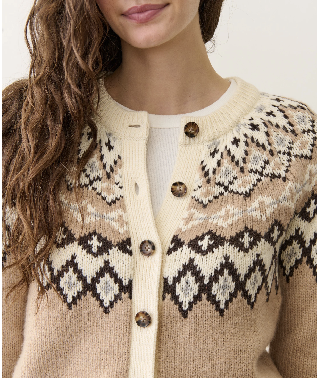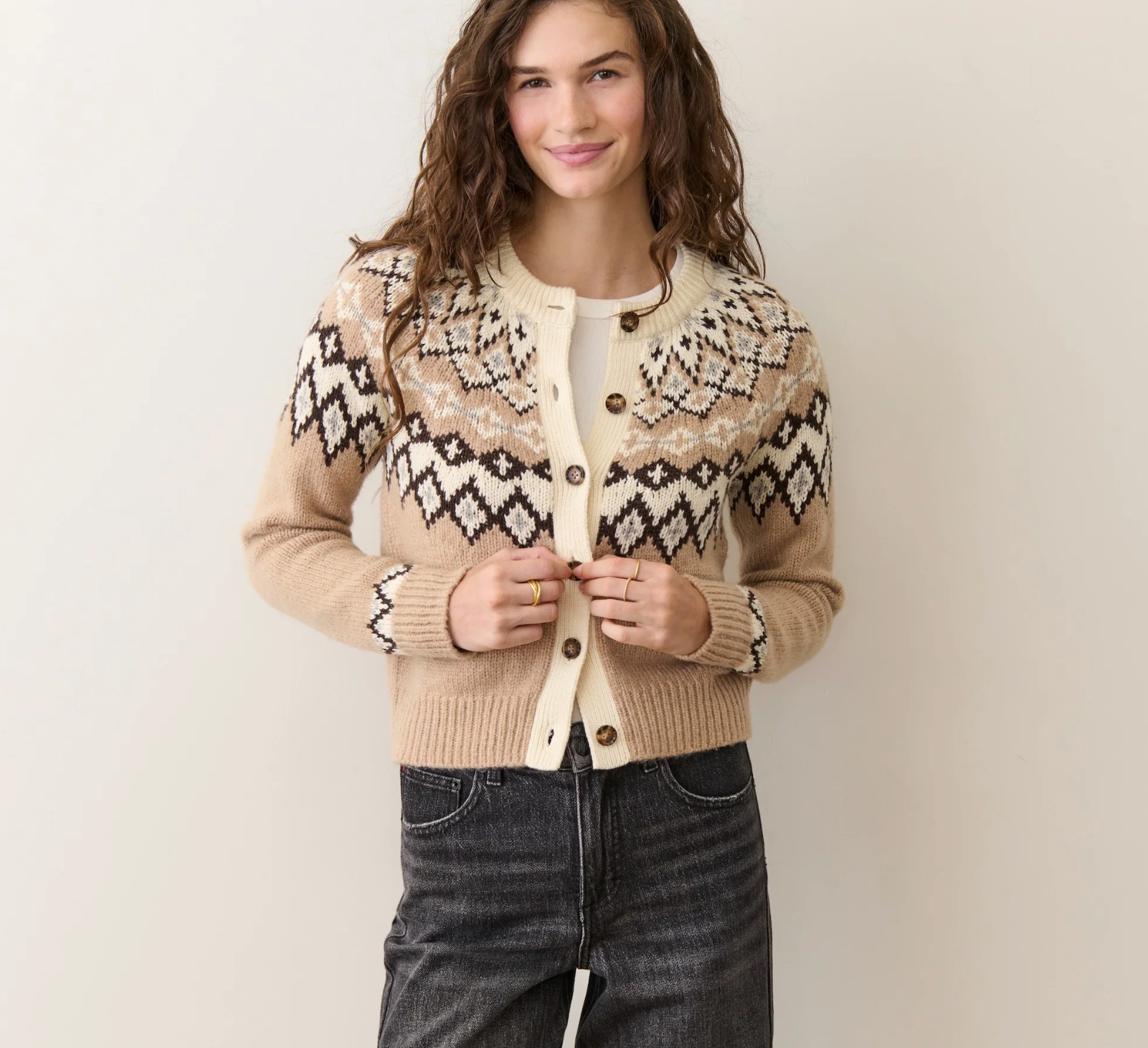 If you love a Fair Isle sweater, but want a few more styling options? This cardigan is your girl. She has an easy relaxed fit, but a high hip length to keep things from feeling oversized. With the new colors this year, we're including a first-ever true neutral in gray. Did we mention there are matching hats for all the colors? There are matching hats.