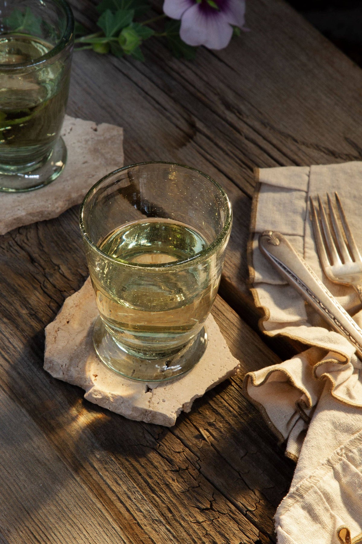 Handblown from recycled glass, these lovely vessels will soon become your new favorite for serving up water, wine, tea and more.
