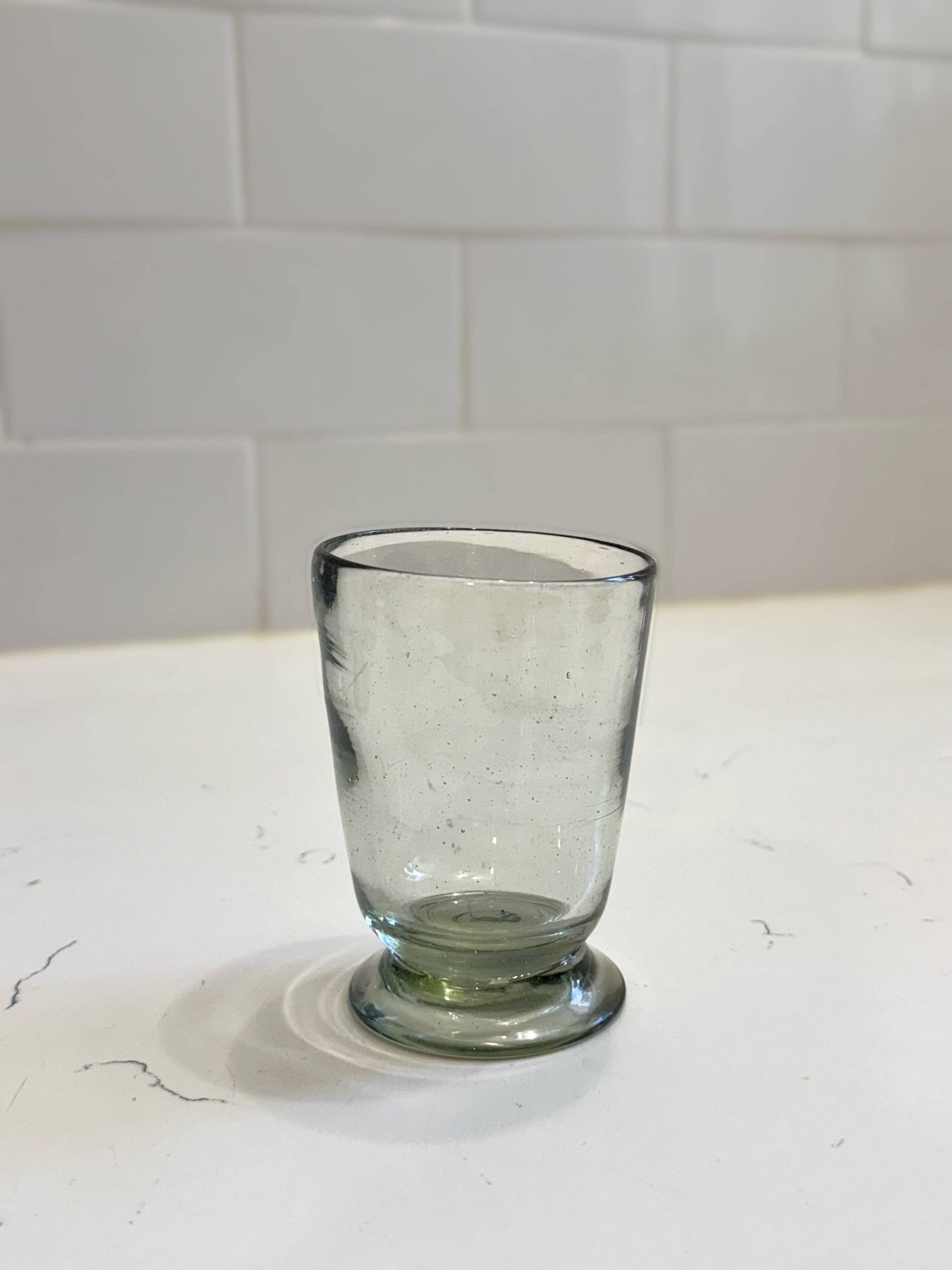 Available in two sizes: Short glass: approx. 3" Dia x 4"H Tall glass: approx. 3" Dia x 5.5"H - 100% Recycled Glass - Food safe - Size & shape will vary (approximately 1/2") from piece to piece. - Dishwasher safe. - Not microwave or oven safe Handmade in Mexico