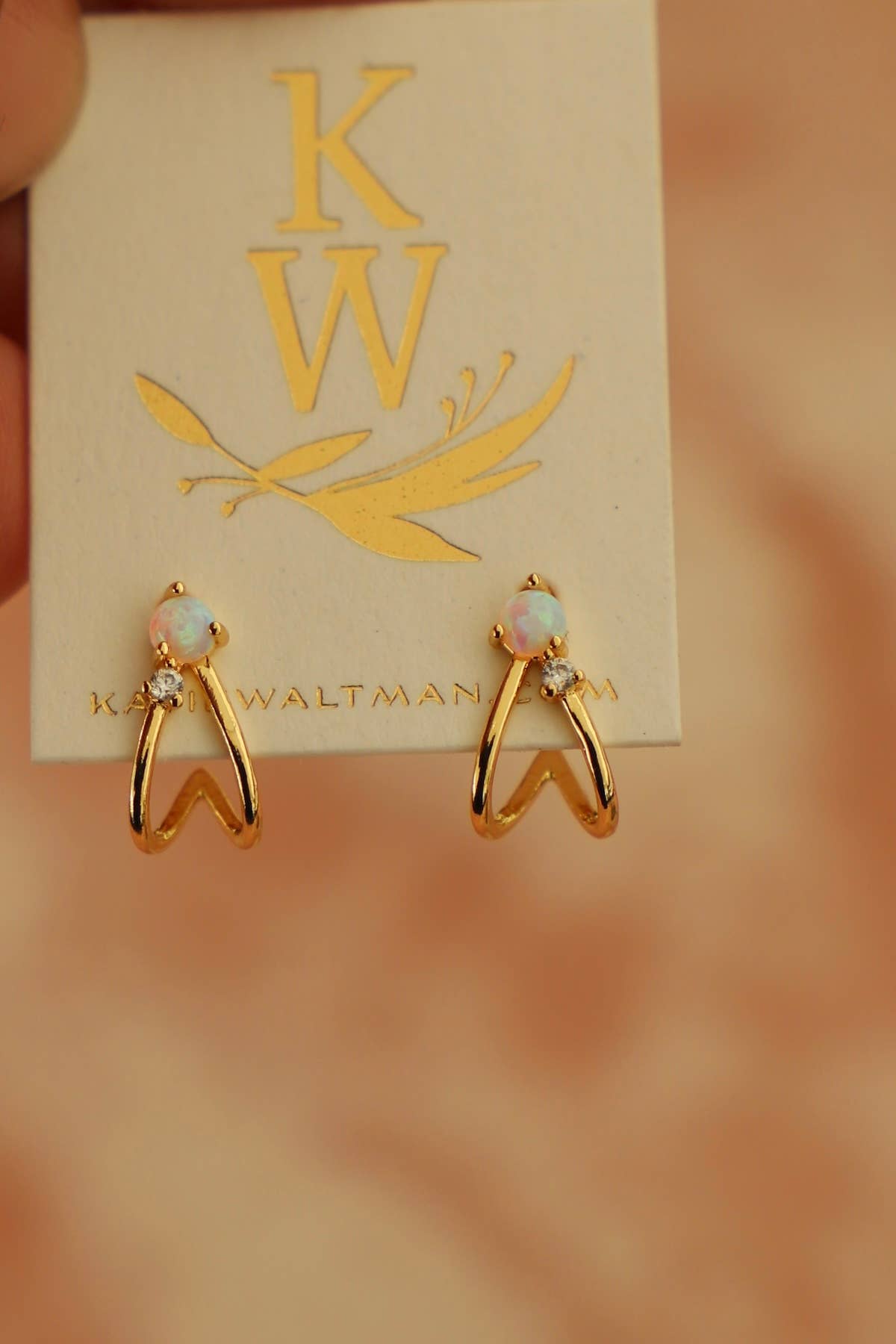 The Cyrus Opal Stud Hoops are a unique twist on our popular classic opal styles. These earrings gently hug the ear and offer a subtle but sparkling touch to any ear stack.