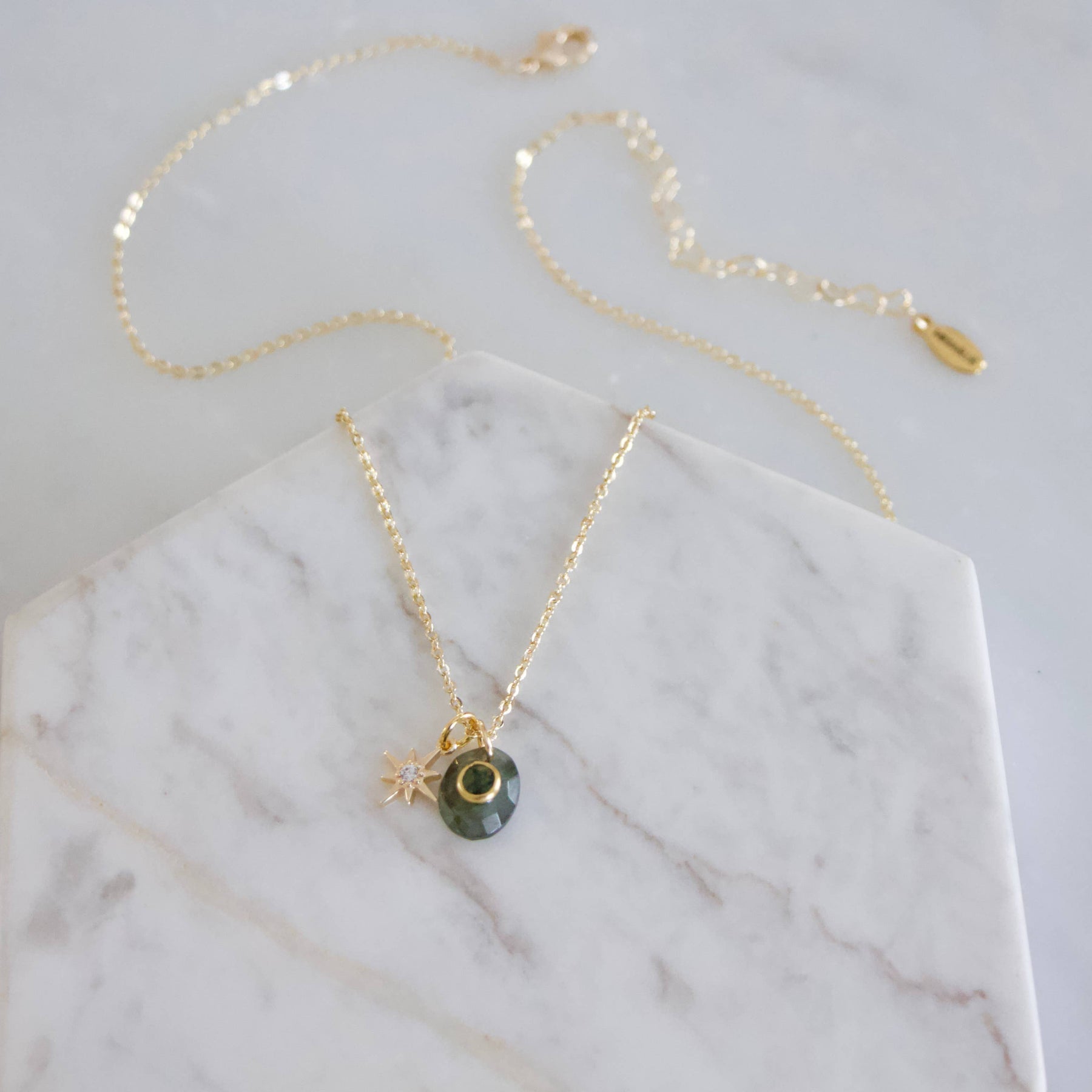 Faceted Labradorite with a Moss Agate Inlay Star Necklace Details: • MATERIAL: 18K gold plated over brass, faceted labradorite stone with a moss agate inlay • PENDANT SIZE: 10mm • CHAIN LENGTH: 16" + 2" extender chain • CLASP STYLE: Lobster clasp Arrives on a branded jewelry card