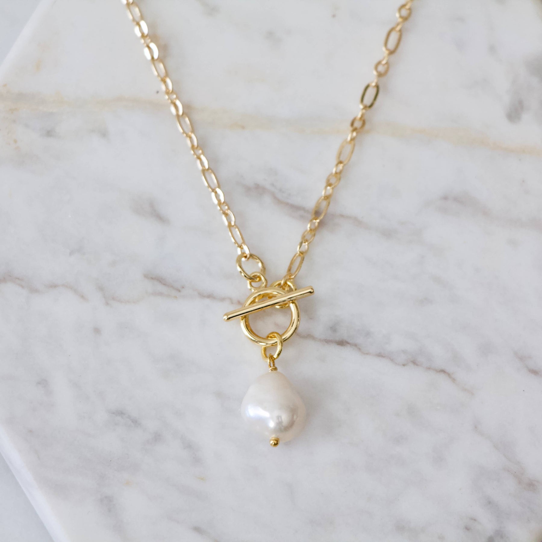 White Pearl Necklace Details: • MATERIAL:18K gold plated over brass, freshwater pearl • PENDANT SIZE: 15x8mm • CHAIN LENGTH: 18" • CLASP STYLE: Toggle Each pearl is one of a kind and totally unique. Arrives in a clear bag
