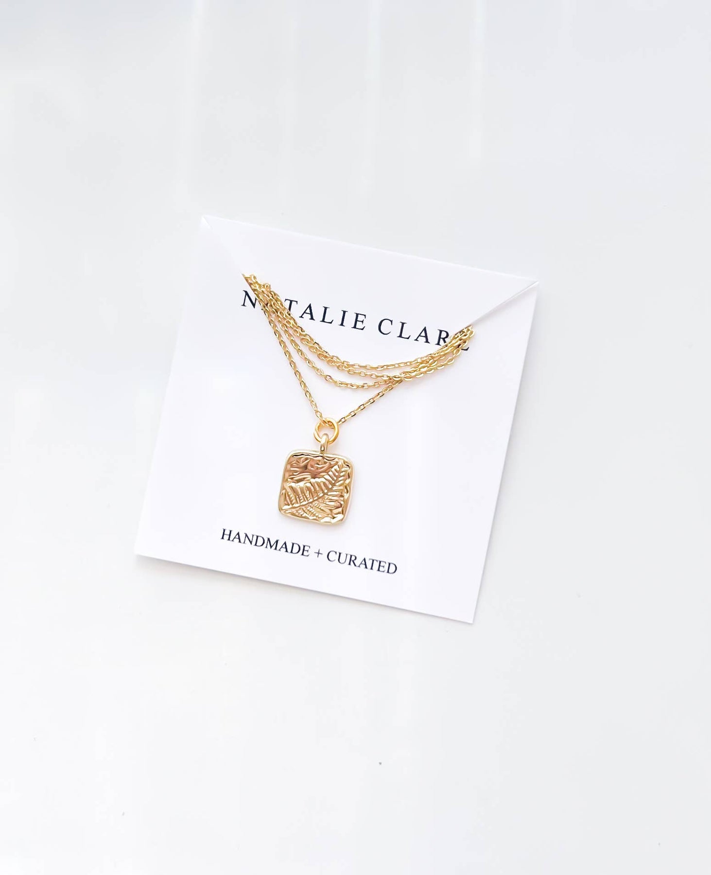 NOTE: Product shots reflect the updated charm design. Model photos do not. Necklace now has a square charm. Length and size are the same. This beautiful fern necklace is a nod to the nature lovers. Made of gold plated stainless steel, this necklace hangs at 18 inches with a square acrylic pendant at the end featuring a fern leaf. To extend the life of your jewelry keep it clean and dry, avoid showering and swimming in your jewelry. Avoid spraying perfumes and oils directly on jewelry. To keep jewelry clean and tarnish free, wipe down with a jewelers cloth.