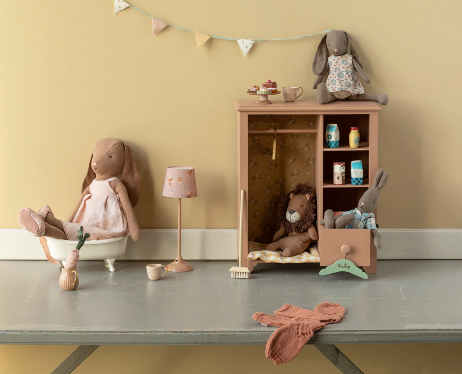 The beautiful Maileg miniature floor lamp is a must-have. The lamp will light up the room with a soft tone - remember to turn off the light when the friends go to bed. The product comes without battery, but you can add a coin cell battery (CR2032).