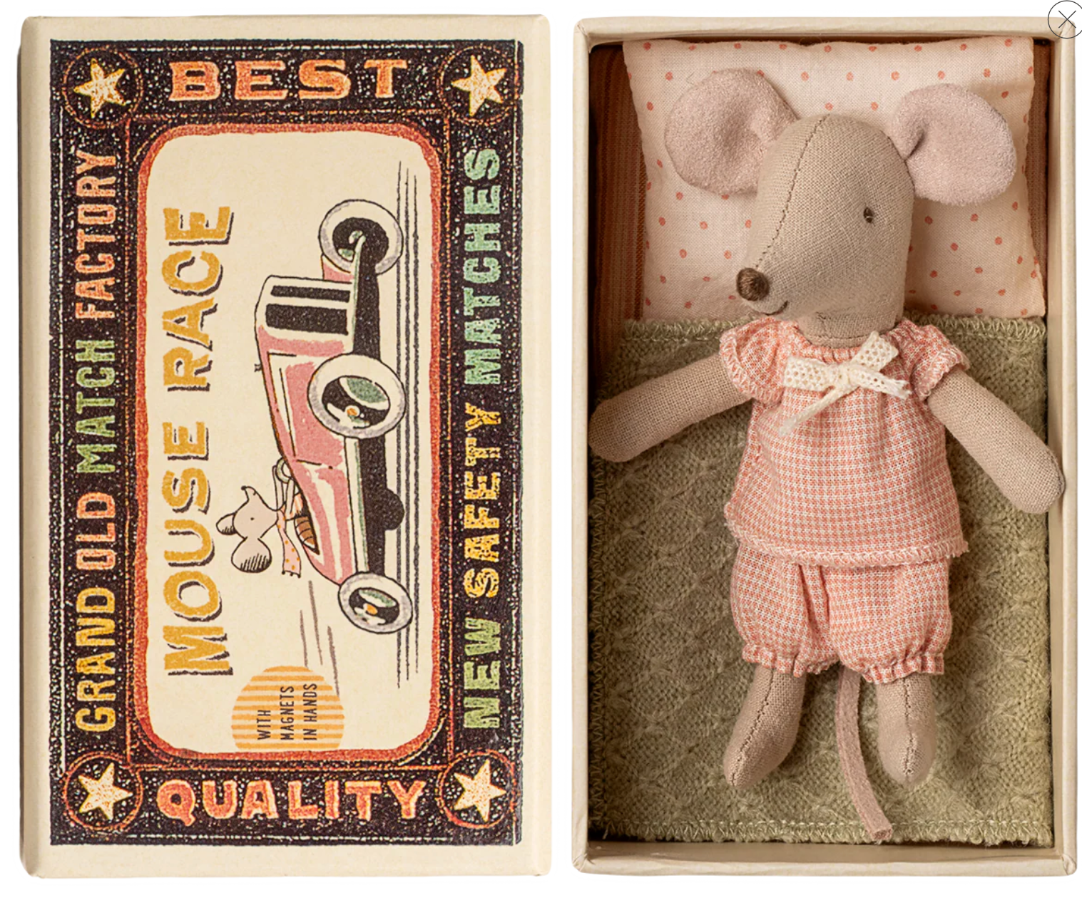 A classic Maileg item, this mouse is ready for hours of play and sleeps soundly in its little matchbox. The clothes and bedding are made of soft fabrics with unique prints in beautiful colors. The mouse has magnets in its hands.