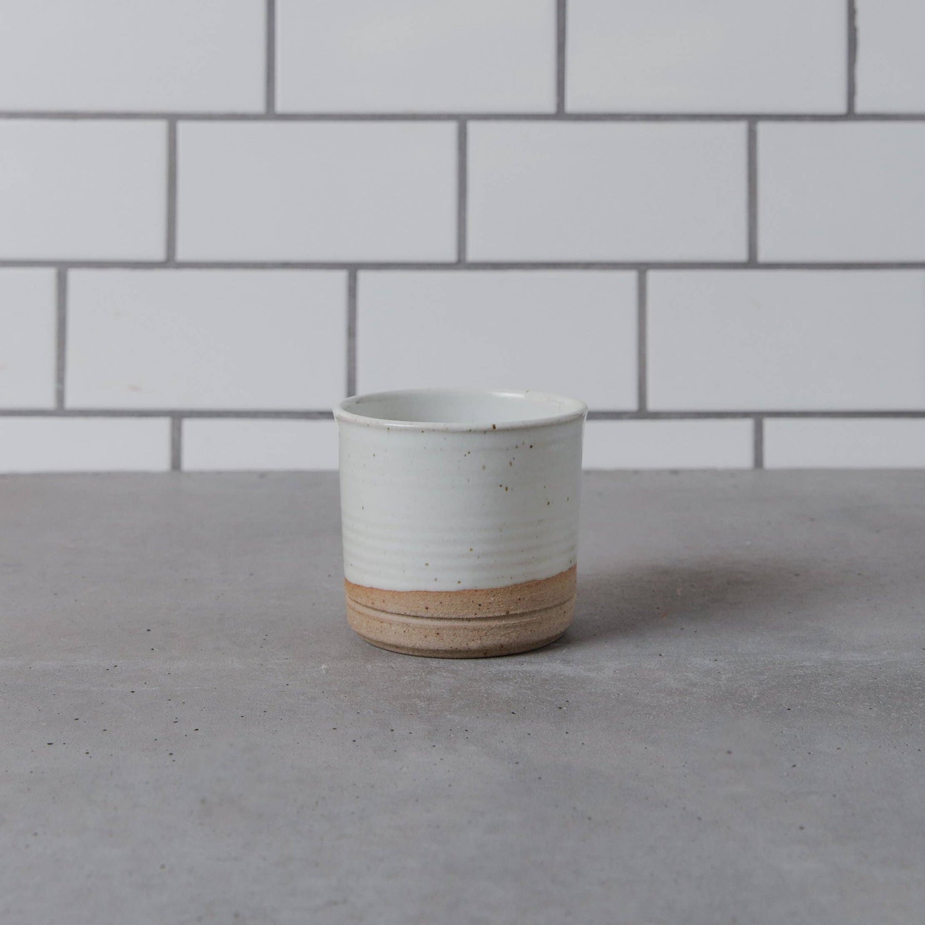 Hand thrown ceramic half pint tumbler. A perfect little cup for black coffee, wine, whiskey, or tea. Stoneware retains its temperature longer than glassware, and may be placed in your microwave, oven, or dishwasher. Holds approximately 8 ounces. Approximately 3" wide by 3" tall. Microwave, dishwasher, oven safe. Hand thrown, hand glazed.