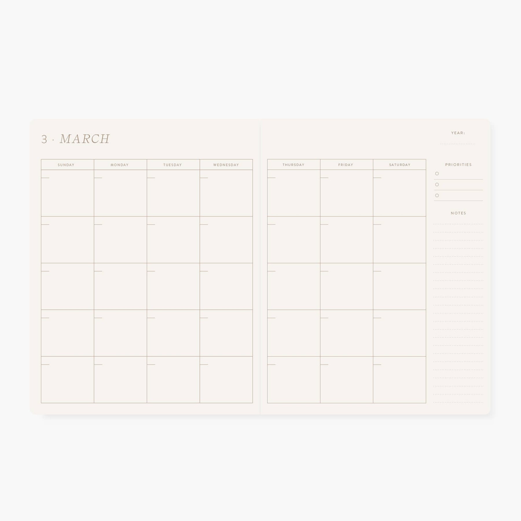 The botanical illustrated cover features a canvas texture that is durable enough to withstand daily use. Printed full color with gold foil accents. ~ Size 7" x 9" ~ Undated, January-December ~ Features monthly schedule, year at a glance, birthdays section, and notes. ~ FSC certified ivory text paper stock interior pages. ~ Thread-stitched, lay-flat binding ~ Rounded corners