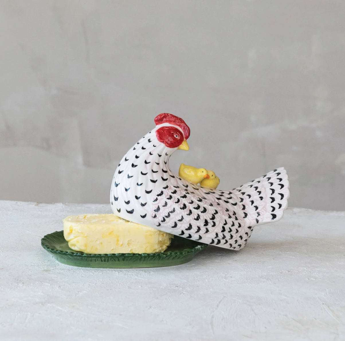 This charming hen-shaped butter dish brings farmhouse whimsy to your kitchen! Crafted as a vintage reproduction with hand-painted details, it features a mother hen and her adorable chicks in a delightful design. Perfect for serving butter at the table or displaying as a cheerful kitchen accent. A delightful conversation starter that adds personality and nostalgic charm to any home.