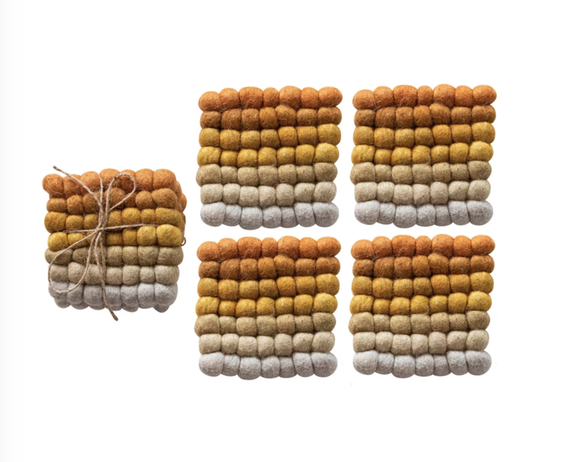 This set of four handmade wool felt ball coasters is a beautiful and practical piece that will enhance the home with its square shape and its red, pink and blush colors. The coasters are made of wool felt, a natural and renewable material handcrafted by felting wool fibers together. Wool felt is warm, comfortable, and eco-friendly. The coasters have a colorful and cozy design that can brighten up any boho, cottagecore, farmhouse, cabin, or eclectic style decor. Use it to protect the table or countertop from hot or cold drinks. They are also soft and durable, easy to clean and store. Each coaster measures 4 inches in length and 4 inches in width. Whether for everyday use or special occasions, this set of four handmade wool felt ball coasters will add a touch of texture and fun to the table or kitchen.