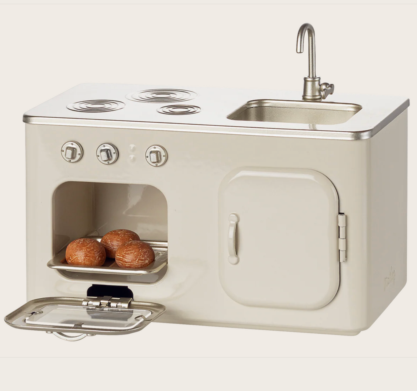 Our beautiful miniature kitchen is a must-have in any home. It fits perfectly into the Maileg House of miniature dollhouse. The kitchen comes with 3 freshly baked buns in the oven and is made in metal to ensure a long lifetime with hours of play.