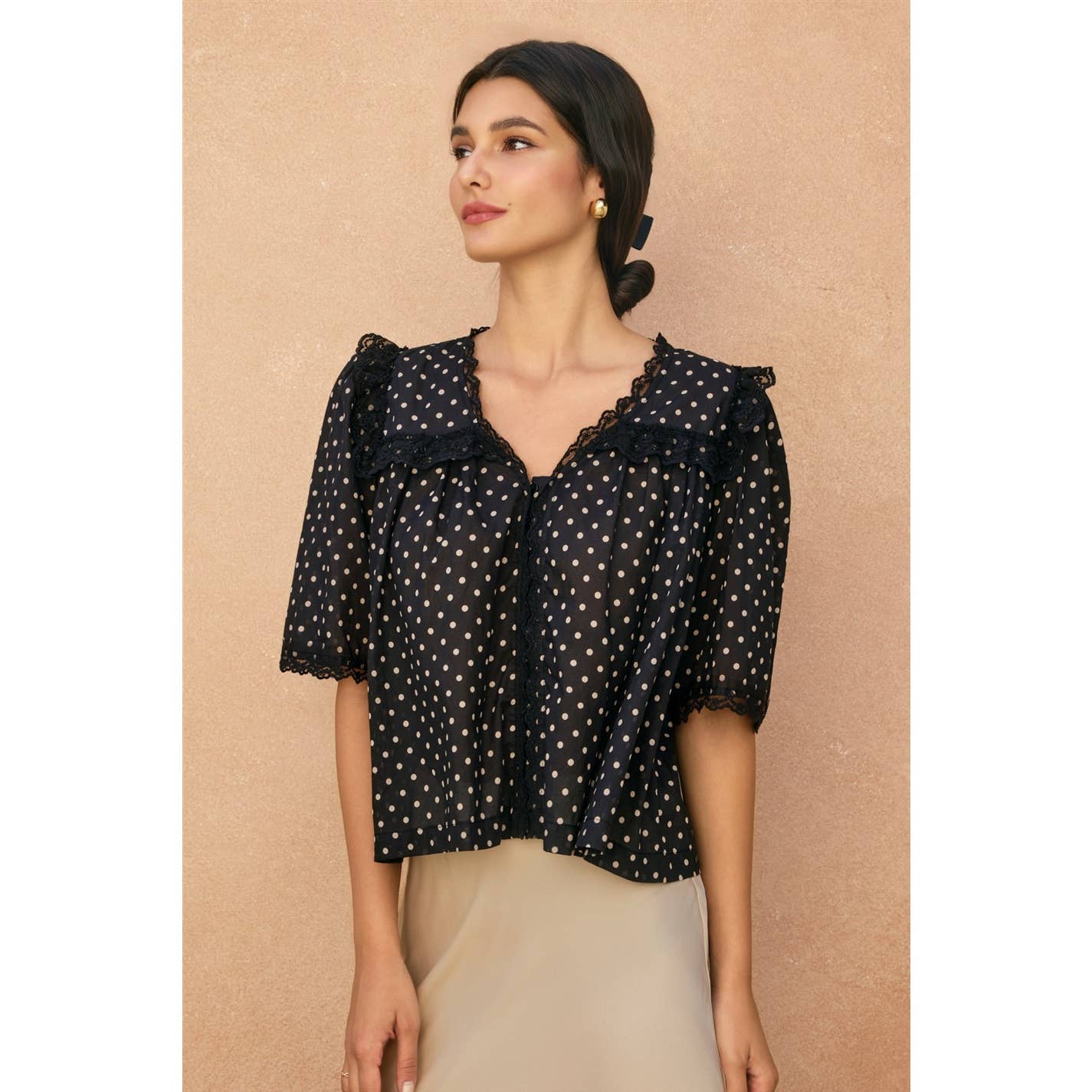 Polka dot blouse with lace trim. Model is 5'9" and wearing Small. - Collar detail - Lace detail - Shirred bodice - Front button down closure - No elastic band, smocking - No pocket - Unlined Shell: 100% Cotton Lining: None