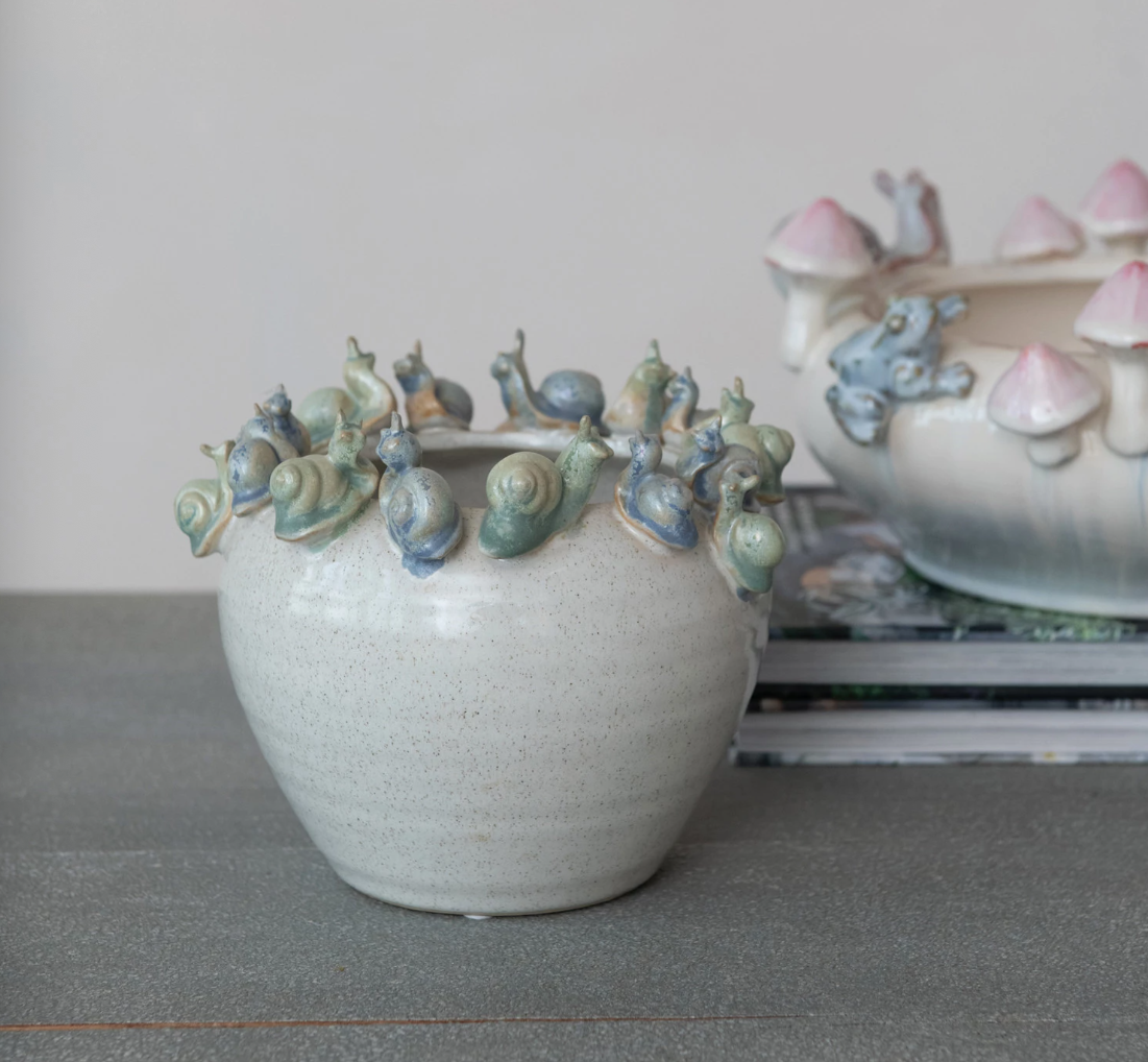 7" Round x 6"H Stoneware Planter w/ 3D Snails on Rim, Reactive Glaze, Blue, Green & Cream Color Speckled (Holds 4" Pot) (Each One Will Vary)